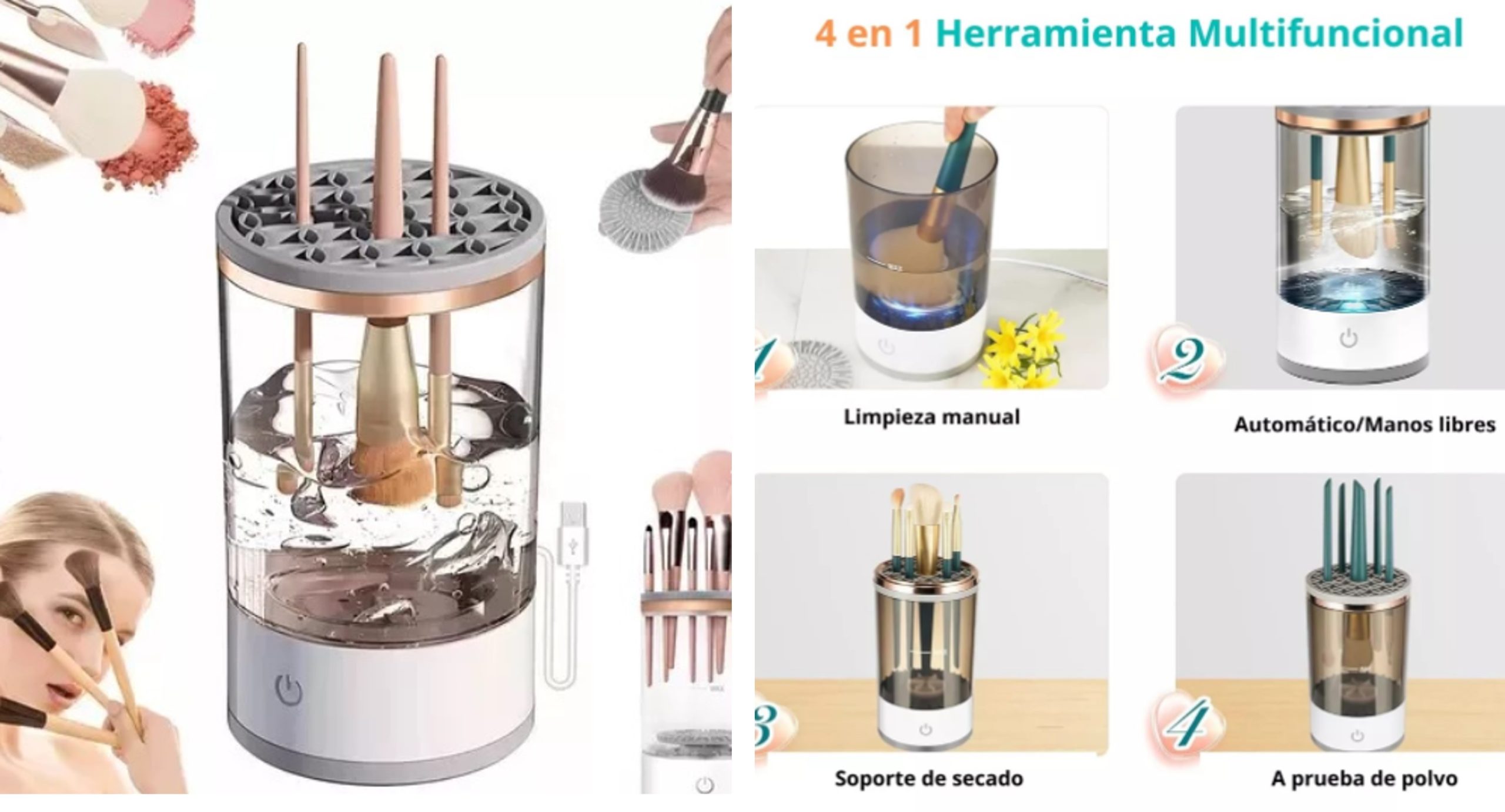 La Lavadora de Brochas es un dispositivo innovador diseñado para limpiar y secar brochas de maquillaje de manera rápida y eficiente. Este producto es ideal para quienes desean mantener sus brochas higiénicas y en buen estado sin el trabajo manual que usualmente implica su limpieza, facilitando una rutina de cuidado personal más cómoda y efectiva.