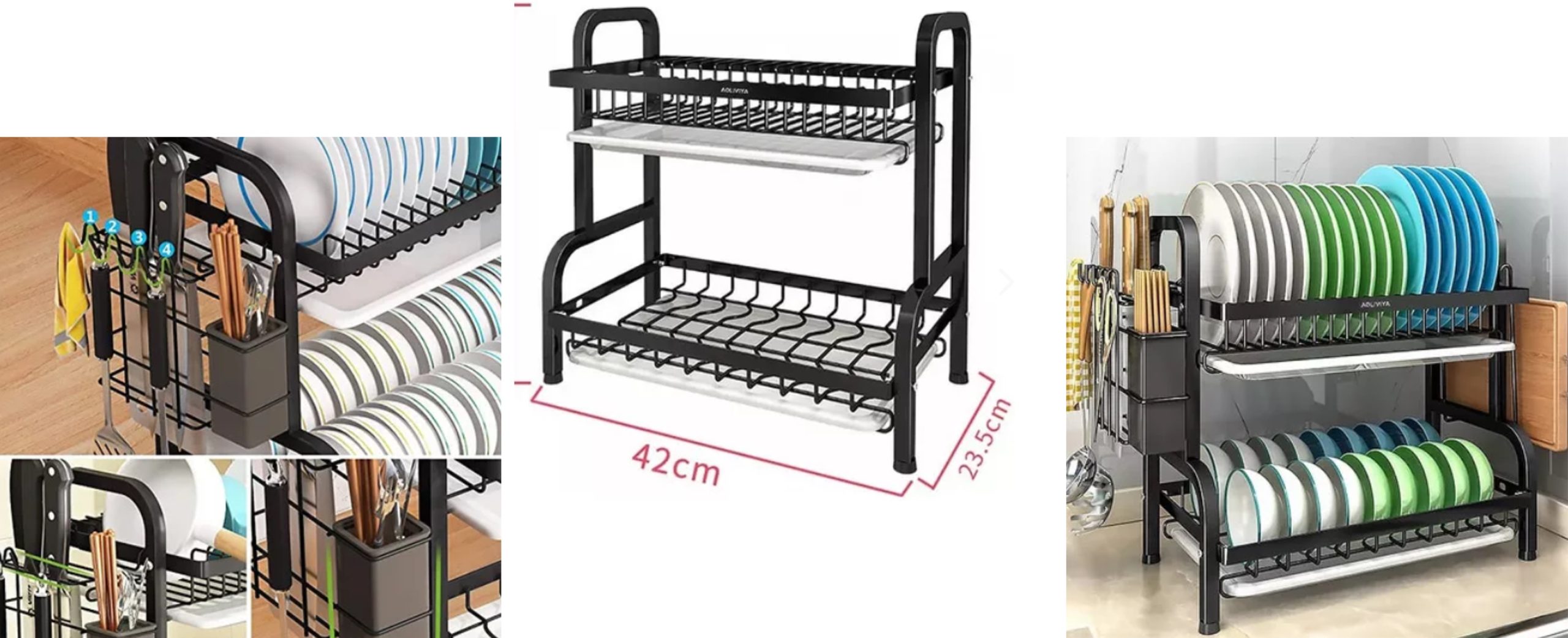 El Secador Escurridor de Platos de 2 Niveles es un accesorio de cocina diseñado para maximizar el espacio y permitir el secado eficiente de platos, tazas, utensilios y otros artículos de cocina después del lavado. Al tener dos niveles, proporciona mayor capacidad de almacenamiento sin ocupar mucho espacio en la encimera, ideal para cocinas pequeñas o con limitaciones de espacio.